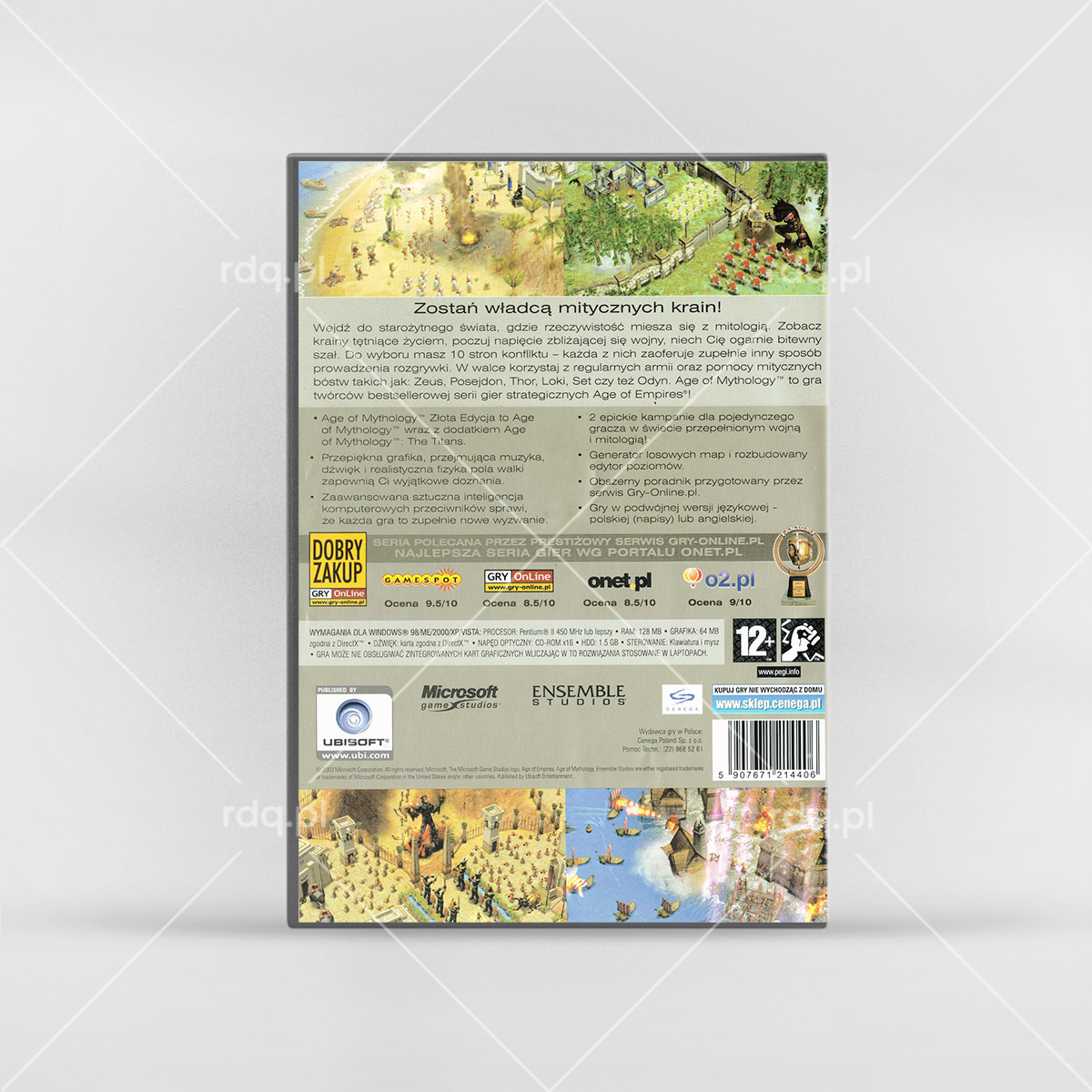 Age of Mythology: Złota Edycja Rok wydania: 2007 Producent: Ensemble Studios Wydawca: Ubisoft Wydanie: PL - Cenega Gatunek: RTS, Strategiczna, Mitologia Tryb: Singleplayer, Multiplayer Pudełko