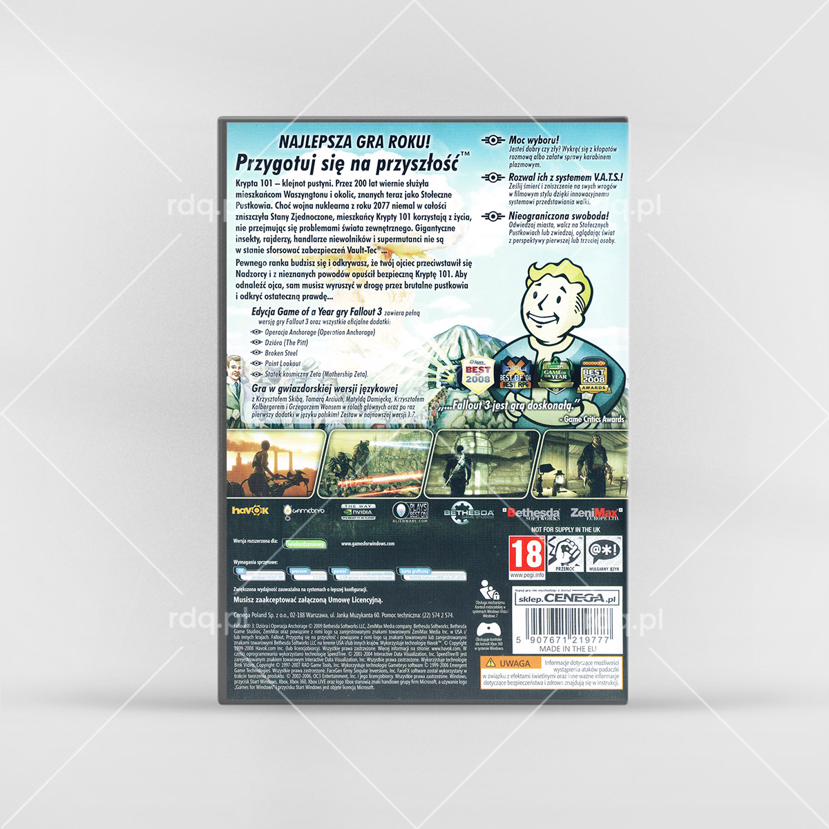 Fallout 3 (GOTY) Rok wydania: 2008 Producent: Bethesda Wydawca: Bethesda Wydanie: PL - Cenega Gatunek: TPP, FPP, RPG, Gra akcji, Post-apo Tryb: Singleplayer Pudełko Kategoria: DVD BoxPrzez Radek Jakubiak3 kwietnia 2026Project navigationPoprzedniePrevious project:The Suffering + Ties That Bind