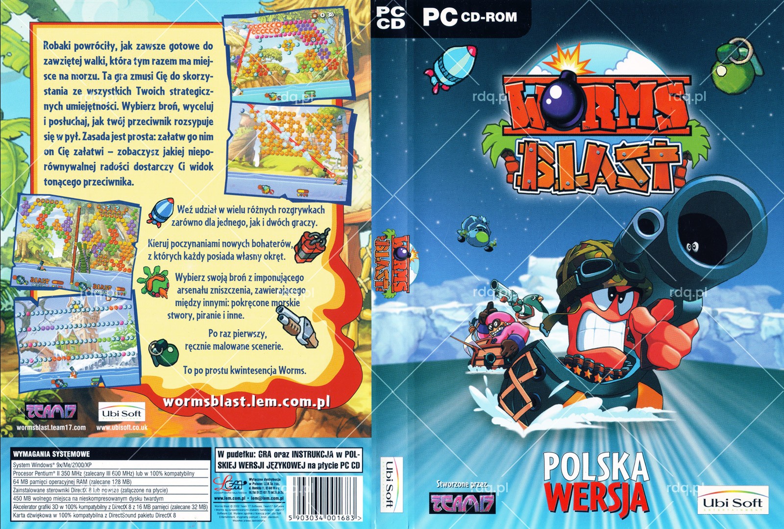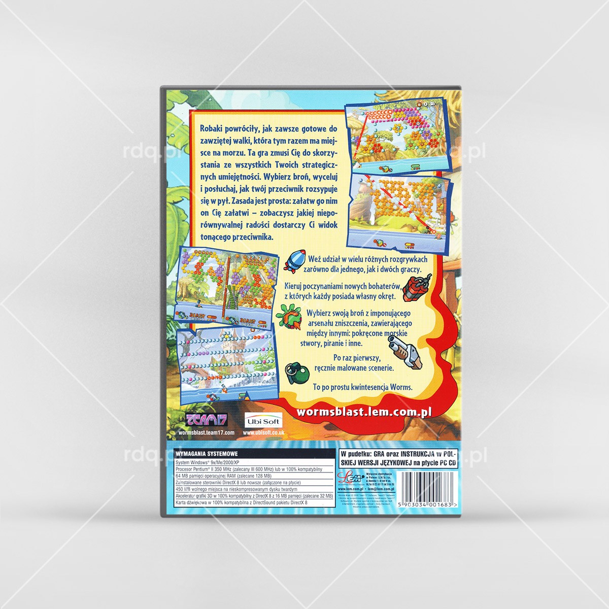 Worms Blast Rok wydania: 2002 Producent: Team17 Wydawca: Ubisoft Wydanie: PL - Licomp Empirical Multimedia Gatunek: Logiczna, Zręcznościowa Tryb: Singleplayer, Multiplayer Pudełko Okładka Kategoria: DVD BoxPrzez Radek Jakubiak27 sierpnia 2025Project navigationPoprzedniePrevious project:Disney’s Extremely Goofy SkateboardingNastępneNext project:BloodRayne