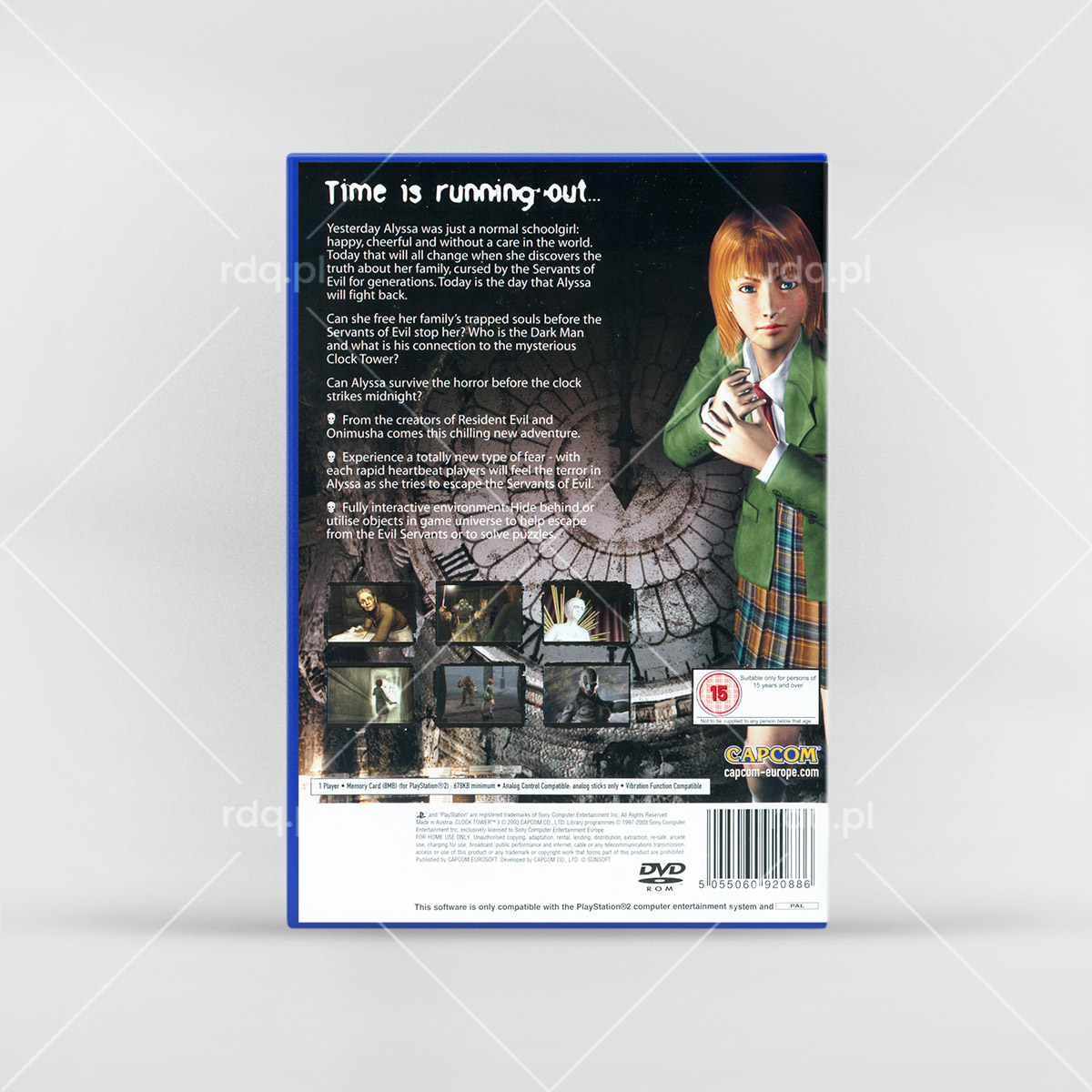 Clock Tower 3 Rok wydania: 2003 Producent: Capcom Wydawca: Capcom Wydanie: UK Gatunek: Gra Akcji, Horror, Przygodowe Tryb: Singleplayer Pudełko