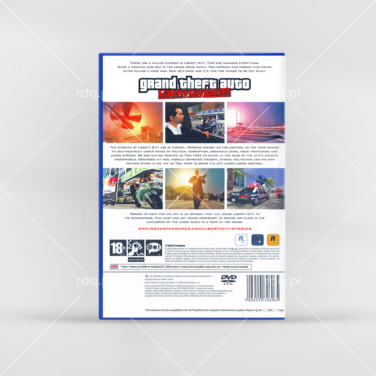 Grand Theft Auto: Liberty City Stories Rok wydania: 2005 Producent: Rockstar Games Wydawca: Rockstar Games Wydanie: UK Gatunek: Gra Akcji, TPP, Samochodowa Tryb: Singleplayer, Multiplayer Pudełko Tagi Grand Theft Auto GTA Playstation Rockstar Games