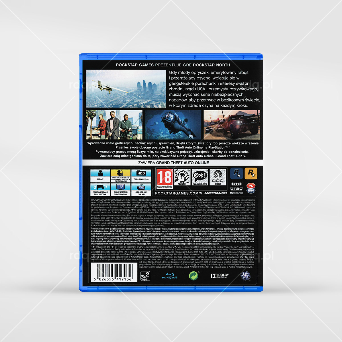 Rok wydania: 2014 Producent: Rockstar Games Wydawca: Rockstar Games Wydanie: PL - Cenega Gatunek: TPP, FPP, Samochodowa, Gra Akcji Tryb: Singleplayer, Multiplayer