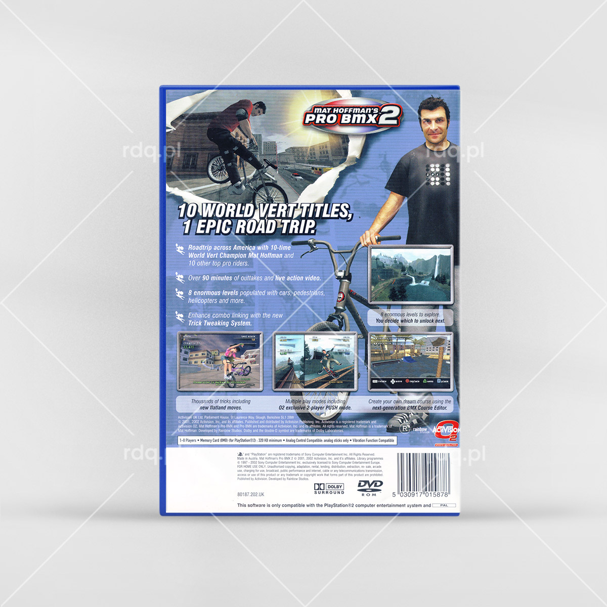 Mat Hoffman's Pro BMX 2 Rok wydania: 2002 Producent: Rainbow Studios Wydawca: Activision O2 Wydanie: UK Gatunek: BMX, Zręcznościowa, Sportowa Tryb: Singleplayer, Multiplayer Pudełko